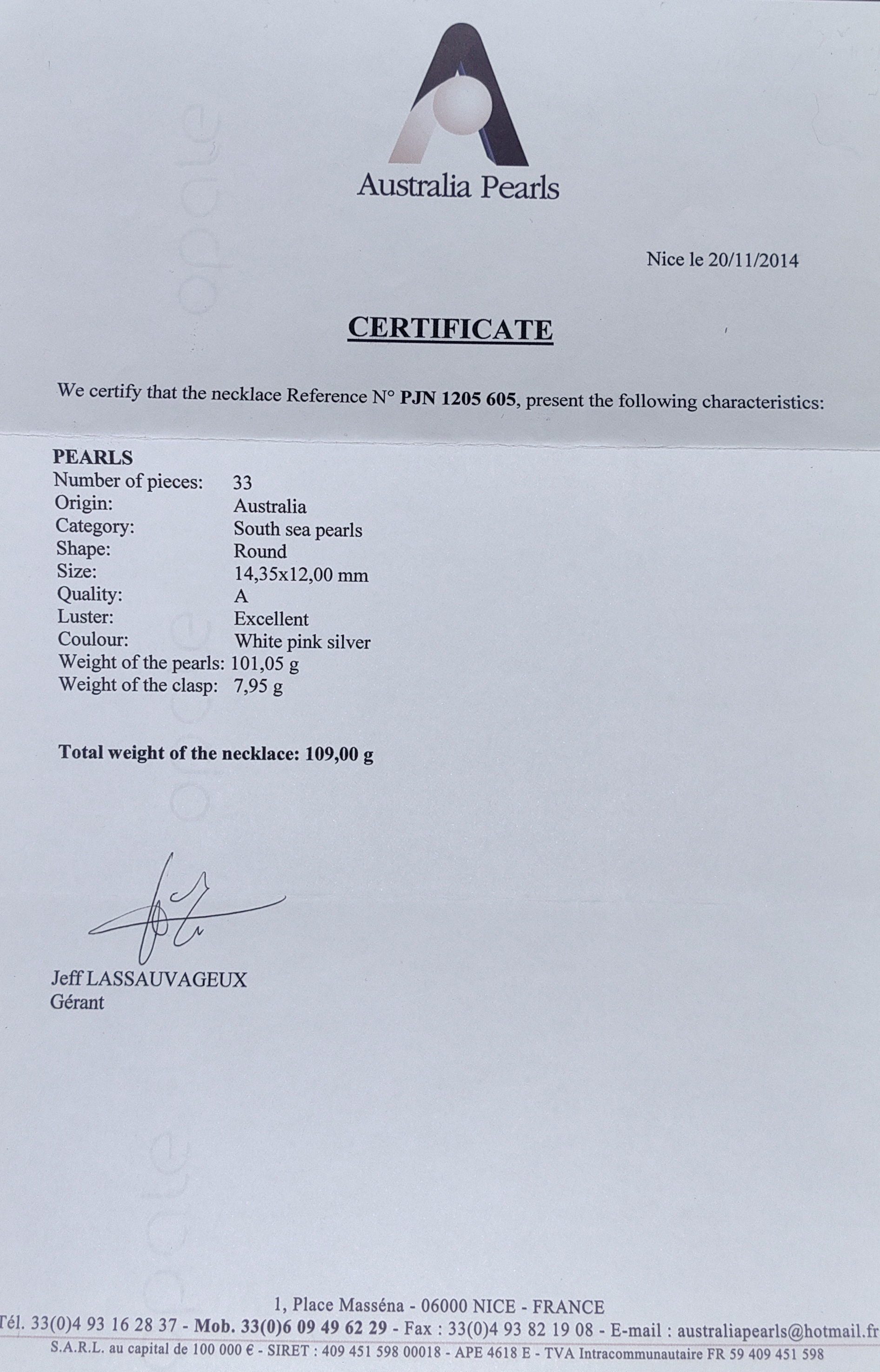 Белое , Золото 750 пробы - 33 белого морского круглого жемчуга Ø 11-15 мм
